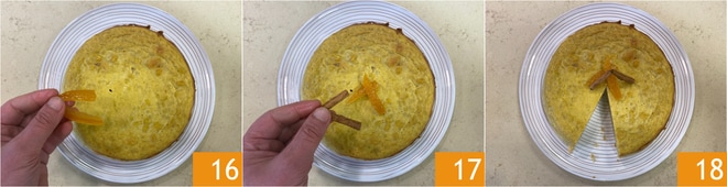 Nach der Backzeit aus dem Ofen nehmen und abkühlen lassen, dann den Kuchen aus der Form lösen und mit kandierter Orange 16 und Zimtstangen 17 garnieren. Ihr süßer Reis-Ricotta-Kuchen ist servierbereit 18!
