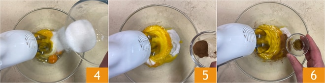 In der Zwischenzeit geben Sie die Eier und den Zucker 4 in eine Schüssel, dann fügen Sie den Zimt 5 und das Vanilleextrakt 6 hinzu. Schlagen Sie die Mischung, bis sie die Farbe wechselt, sie sollte nicht übermäßig luftig sein.