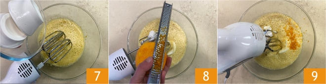 Fügen Sie den Ricotta 7, die geriebene Orangenschale 8 und eine Prise Salz hinzu und vermischen Sie alles nochmals mit den Quirlen 9, bis eine homogene Mischung entsteht.
