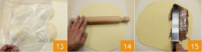 Lassen Sie die 4 Kugeln mindestens 20 Minuten bei Raumtemperatur unter Frischhaltefolie 13 ruhen. Bestäuben Sie anschließend eine Arbeitsfläche leicht mit Mehl, drücken Sie jede Kugel leicht flach und rollen Sie sie mit einem Nudelholz auf einem Stück Backpapier aus, bis Sie einen Kreis mit einem Durchmesser von 26 cm erhalten 14; lassen Sie den Kreis im Kühlschrank mindestens 20 Minuten fest werden und machen Sie mit den anderen weiter, wiederholen Sie die gleichen Schritte. Nehmen Sie dann den ersten Kreis aus dem Kühlschrank, den Sie ausgerollt hatten, und bestreichen Sie die Oberfläche mit der Nutella 15;