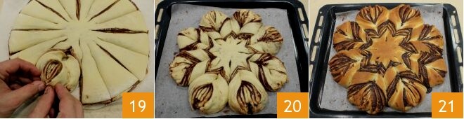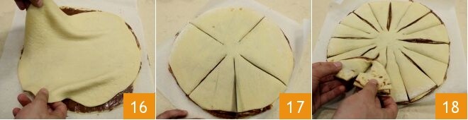 nehmen Sie dann einen weiteren Kreis und legen Sie ihn auf die Nutella-Schicht 16; fahren Sie auf diese Weise fort, bis alle Zutaten aufgebraucht sind: die letzte Schicht sollte aus Briocheteig bestehen. Lassen Sie alles mindestens 30 Minuten im Kühlschrank unter Frischhaltefolie ruhen (um Ihnen beim Transfer zu helfen, können Sie den Teig auf ein Tablett legen und in den Kühlschrank stellen). Schneiden Sie die Oberfläche ein, lassen Sie dabei einen Rand von der Mitte; beginnen Sie mit 4 Kreuzschnitten, dann machen Sie zwischen jedem Schnitt einen weiteren 17. Fahren Sie fort, bis Sie 16 Einschnitte erhalten haben; nehmen Sie jedes Stück mit den Fingern und drehen Sie es in entgegengesetzte Richtungen, wobei Sie eine vollständige Drehung machen 18