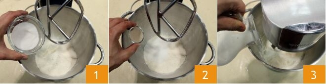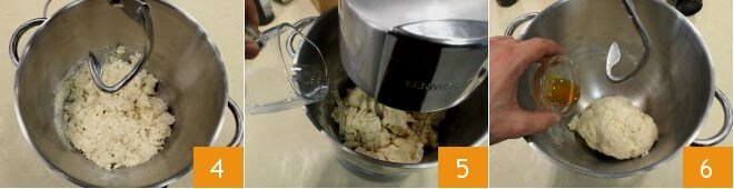 Wenn sich die flüssigen Zutaten aufgenommen haben, entfernen Sie den Flachrührer und montieren Sie den Knethaken 4, dann starten Sie die Küchenmaschine erneut und gießen Sie das lauwarme Wasser in einem dünnen Strahl hinzu 5; fügen Sie dann das Malz hinzu 6 (alternativ können Sie dieselbe Menge Honig verwenden);