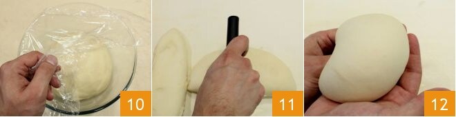 Formen Sie dann eine Kugel aus dem Teig, legen Sie sie in eine leicht gebutterte Schüssel und bedecken Sie sie mit Frischhaltefolie 10. Lassen Sie ihn 3 Stunden in einem ausgeschalteten Ofen mit eingeschaltetem Licht gehen (oder bis er sich verdoppelt hat); nach dieser Zeit nehmen Sie den Teig und teilen Sie ihn in 4 gleich schwere Teile 11. Formen Sie jedes Stück zu einer runden Form 12.