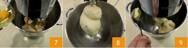 geben Sie dann die Eier nacheinander hinzu 7, warten Sie, bis sie eingearbeitet sind, bevor Sie ein weiteres hinzufügen. Kneten Sie, bis eine glatte und homogene Konsistenz erreicht ist und der Teig sich von den Seiten ablöst und am Haken haftet 8. Zu diesem Zeitpunkt können Sie die weiche Butter Stück für Stück hinzufügen, warten Sie, bis sie aufgenommen ist, bevor Sie ein weiteres Stück hinzufügen 9. Wenn die gesamte Butter aufgenommen wurde und der Teig glänzend und gut verknetet ist, stoppen Sie die Küchenmaschine, übertragen Sie den Teig auf eine Arbeitsfläche, fetten Sie Ihre Hände mit Butter ein und kneten Sie einige Minuten weiter.