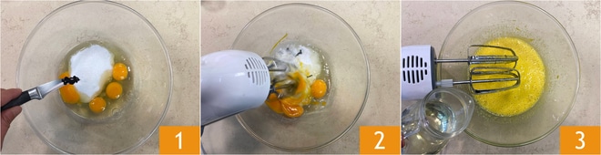 Um den Nua Kuchen zuzubereiten, beginnen Sie mit dem Teig: Arbeiten Sie die Eier mit dem Zucker mit einem elektrischen Schneebesen, fügen Sie eine Prise Salz und die Samen der Vanilleschote hinzu 1 2 (die Schote beiseitelegen, da sie für die Vanillecreme benötigt wird). Die Mischung sollte schaumig sein. Erst dann das Pflanzenöl in einem dünnen Strahl 3 dazugeben und mit dem Schneebesen weiterarbeiten.