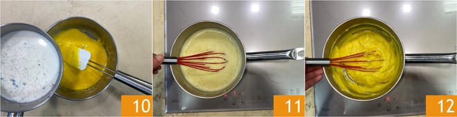 Wenn die Milch fast kocht, können Sie sie nach und nach zu der Eigelbmischung geben 10 und mischen. Sobald die gesamte Milch zur Eigelbmischung gegeben wurde, können Sie die Hitze wieder auf niedriger Stufe einschalten und die Creme unter ständigem Rühren kochen 11, bis sie vollständig gekocht und die richtige Konsistenz erreicht ist 12.
