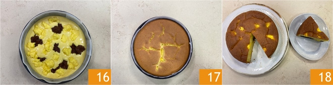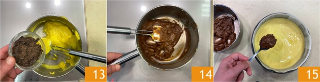 Teilen Sie die erhaltene Creme in zwei Teile und geben Sie in eine davon 50 g gehackte Zartbitterschokolade 13. Mit dem Schneebesen mischen, um sie vollständig zu schmelzen 14. Auf den Teig des Kuchens legen Sie zuerst sehr vorsichtig die Schokoladencreme mit zwei Löffeln 15 und verteilen die Häufchen gut verteilt.