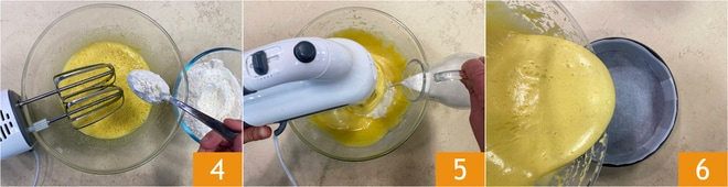 Das gesiebte Mehl mit dem Backpulver nach und nach hinzufügen 4. Zum Schluss die Milch in einem dünnen Strahl 5 dazugeben und die Mischung weiter bearbeiten, um sie zu vermischen. Alles in eine mit Backpapier ausgelegte Springform mit 24 cm Durchmesser gießen 6.