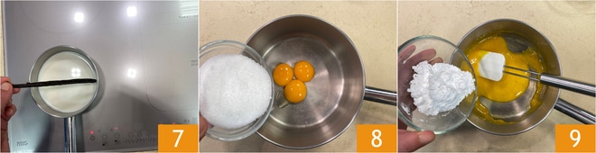 Fahren Sie mit der Vanillecreme fort: Erhitzen Sie in einem kleinen Topf die Milch, aromatisiert mit der vanillesamenfreien Schote 7. In einem anderen Topf die Eigelbe mit dem Zucker kalt mischen 8, dann die Reisstärke hinzufügen 9 und nochmals mischen, um eine glatte, homogene Mischung zu erhalten.