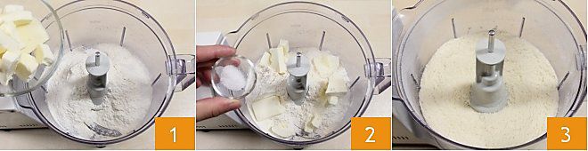 Um den rustikalen Kartoffel-Zwiebel-Kuchen zuzubereiten, beginnen Sie mit dem Mürbeteig. Falls nötig, können Sie das Verfahren Mürbeteig nachlesen. Geben Sie das Mehl in den Mixer und fügen Sie die kalte, in Stücke geschnittene Butter hinzu 1. Dann fügen Sie das Salz hinzu 2 und schalten Sie den Mixer ein, um eine sandige Mischung zu erhalten 3.