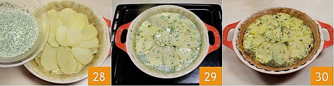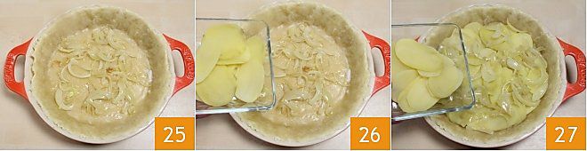 Beginnen Sie dann mit dem Zusammenstellen Ihres rustikalen Kuchens: Legen Sie eine Schicht Zwiebeln auf den Teig 25, dann fügen Sie die Kartoffelscheiben hinzu und fahren Sie fort, die Schichten zu wechseln, bis die Zutaten aufgebraucht sind (26-27). Beenden Sie mit der Schicht Kartoffeln.
