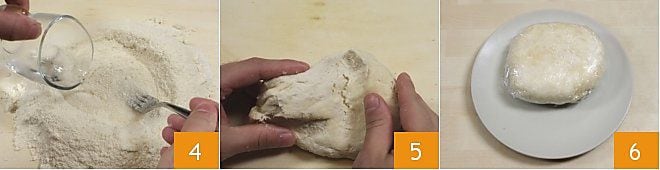 Gießen Sie die Mischung auf eine kalte Arbeitsfläche und formen Sie den klassischen Brunnen, in dessen Mitte Sie nach und nach das Wasser gießen, dabei mit einer Gabel umrühren, um nach und nach das Mehl vom Rand aufzunehmen 4. Kneten Sie dann alles zügig, bis Sie einen kompakten und elastischen Teig erhalten 5. Formen Sie einen Teigballen und wickeln Sie ihn in Frischhaltefolie 6, dann legen Sie ihn für mindestens 30 Minuten in den Kühlschrank.