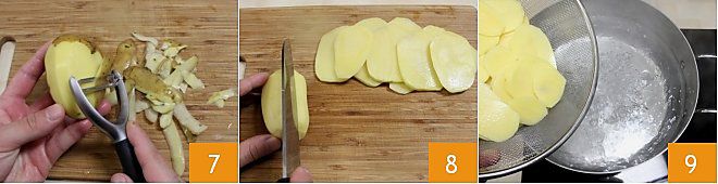Während der Teig ruht, bereiten Sie die Füllung des Kuchens vor: Waschen Sie die Kartoffeln gründlich unter fließendem Wasser und schälen Sie sie mit einem Sparschäler oder einem kleinen Messer 7, dann schneiden Sie sie in Scheiben von etwa 3-4 mm 8. In einem großen Topf bringen Sie Wasser zum Kochen, salzen Sie es und tauchen Sie die Kartoffelscheiben ein 9.