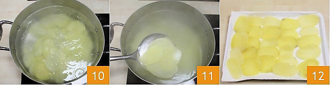 Blanchieren Sie die Kartoffelscheiben für 5-6 Minuten 10, dann heben Sie sie mit einem Schaumlöffel heraus 11 und legen Sie sie auf ein mit Backpapier bedecktes Tablett, um sie trocknen zu lassen, wobei Sie darauf achten, die Scheiben nicht zu überlappen 12.