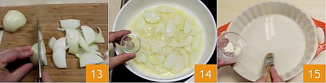 Waschen Sie nun die Zwiebeln, entfernen Sie die äußere Schicht und schneiden Sie sie in Scheiben von etwa 3-4 mm 13. In einer großen Pfanne geben Sie die Butter in Stücken und lassen Sie sie bei niedriger Hitze schmelzen, dann lassen Sie die Zwiebeln ebenfalls bei niedriger Hitze für 5-6 Minuten schmoren, fügen Sie dann Salz und Pfeffer hinzu 14 und schalten Sie die Hitze aus, lassen Sie sie beiseite. Bereiten Sie eine Backform mit einem Durchmesser von 26 cm vor, um den Kuchen zu backen: Zuerst bestreichen Sie die Oberfläche und die Ränder der Backform gründlich mit etwas Butter 15.