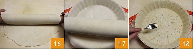 Nehmen Sie dann den Mürbeteig aus dem Kühlschrank, formen Sie ihn mit den Händen rund und rollen Sie den Teig mit dem Nudelholz auf eine Dicke von 3-4 mm aus 16. Legen Sie dann die Backform mit dem ausgerollten Mürbeteig aus 17. Drücken Sie den Teig in die Backform und entfernen Sie mit einem kleinen Messer den überschüssigen Teig an den Rändern, dann stechen Sie den Teig mit den Zinken einer Gabel ein 18.