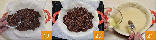 Nun können Sie mit dem Blindbacken des Mürbeteigs fortfahren (für dieses Verfahren können Sie die Kochschule konsultieren: Wie man blind backt), um die Knusprigkeit des Bodens zu fördern: Bedecken Sie den Mürbeteig: Bedecken Sie den Teig mit einem Blatt Backpapier und legen Sie dann trockene Bohnen (oder andere trockene Hülsenfrüchte) darauf 19. Stellen Sie die Backform in den bereits vorgeheizten Ofen bei 180°C für etwa 20 Minuten (bei Umluftofen bei 160°C für 10-15 Minuten) 20. Nach Ablauf der erforderlichen Zeit nehmen Sie die Backform aus dem Ofen, entfernen Sie das Papier mit den Hülsenfrüchten und lassen Sie sie leicht abkühlen. Bestreichen Sie den Boden des Teigs mit Eiweiß 21 und stellen Sie ihn für weitere 5 Minuten bei gleicher Temperatur wieder in den Ofen. Nehmen Sie dann die Backform aus dem Ofen.