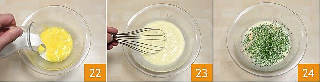 Während der Boden leicht abkühlt, bereiten Sie die Creme vor, um den rustikalen Kuchen zu überziehen: In einer Schüssel verquirlen Sie die Eier mit einer Prise Salz, dann geben Sie die frische flüssige Sahne hinzu 22, mischen Sie alles mit einem Schneebesen 23, fügen Sie die geriebene Muskatnuss und den gehackten Schnittlauch hinzu 24, vermengen Sie die Zutaten und stellen Sie die Mischung beiseite. Diese wird die Überzugscreme für Ihren Kuchen sein.