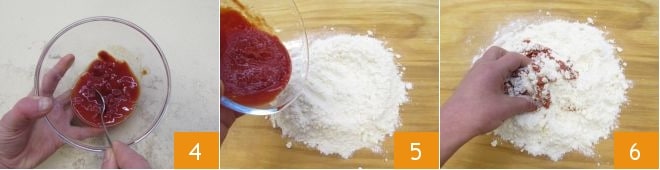 Rühren Sie dann, bis das Tomatenmark vollständig verdünnt ist 4; gießen Sie die Mehl- und Butter-Mischung auf eine Arbeitsfläche (oder auf eine kalte Metall- oder Glasfläche) und machen Sie eine Vertiefung in der Mitte. Gießen Sie das Tomatenmark hinein 5 und kneten Sie kräftig mit den Händen 6.