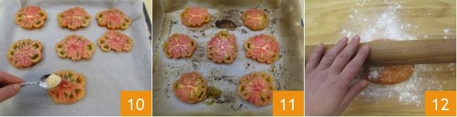 Bestreuen Sie die Tomaten mit braunem Zucker 10 und backen Sie sie im Grillmodus bei 270 °C für 5–6 Minuten. Dann aus dem Ofen nehmen und abkühlen lassen 11. In der Zwischenzeit nehmen Sie den Teig heraus und rollen Sie den Tomaten-Mürbeteig mit einem Nudelholz auf einer leicht bemehlten Arbeitsfläche aus, bis er eine Dicke von 1 cm erreicht 12.