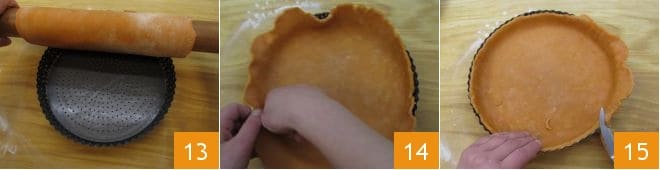 Nehmen Sie dann eine 25 cm große Kuchenform, buttern und mehlen Sie sie. Wickeln Sie den Tomaten-Mürbeteig um das Nudelholz und rollen Sie ihn vorsichtig auf die Form aus 13. Drücken Sie ihn gut auf den Boden und die Ränder der Form, achten Sie darauf, mit den Fingern leicht Druck auf die Ränder auszuüben 14; schneiden Sie mit einem Messer den überschüssigen Mürbeteig ab 15.