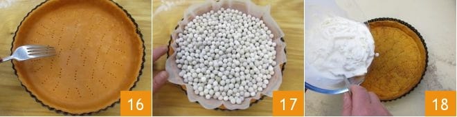 Stechen Sie den Boden mit einer Gabel ein 16, dann fahren Sie fort mit demWie man blind backt Legen Sie ein Blatt Backpapier auf den Mürbeteig und legen Sie Keramikkugeln (oder getrocknete Hülsenfrüchte) darauf 17. Backen Sie im vorgeheizten statischen Ofen bei 200 °C 25 Minuten lang (die Alternative im Umluftofen wird nicht empfohlen). Sobald er fertig ist, nehmen Sie ihn aus dem Ofen, lassen Sie ihn abkühlen und entfernen Sie die Kugeln, dann lassen Sie ihn in der Form abkühlen. Fügen Sie die Stracciatella hinzu 18, indem Sie sie gleichmäßig über die gesamte Oberfläche der Kuchenform verteilen, und helfen Sie sich mit einem Spatel, um sie zu glätten.