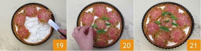 Legen Sie die Tomatenscheiben konzentrisch nebeneinander, bis die gesamte Oberfläche der Quiche bedeckt ist 19; dekorieren Sie mit Basilikumblättern 20 und genießen Sie schließlich die Tomaten-Stracciatella-Quiche 21!