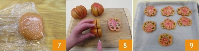 Wenn Sie eine feste, kompakte und ziemlich elastische Masse erhalten haben, formen Sie einen Laib, wickeln Sie ihn in Frischhaltefolie 7 und lassen Sie ihn mindestens 40 Minuten im Kühlschrank ruhen. In der Zwischenzeit bereiten Sie die karamellisierten Tomaten vor. Nehmen Sie die Tomaten und spülen Sie sie unter reichlich fließendem Wasser ab, schneiden Sie sie dann in Scheiben von etwa 2 cm Dicke 8 und legen Sie sie nebeneinander auf ein mit Backpapier ausgelegtes Backblech 9.