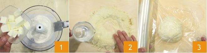 Um den herzhaften Kuchen mit Tropea-Zwiebeln und Silano zuzubereiten, beginnen Sie mit der Mürbeteig. Nehmen Sie einen Mixer und fügen Sie das Mehl und die in grobe Stücke geschnittene kalte Butter aus dem Kühlschrank hinzu, würzen Sie mit Salz 1 und mischen Sie die Zutaten, bis Sie einen sandigen und mehligen Teig erhalten. Gießen Sie die Mischung auf eine Arbeitsfläche und formen Sie einen Brunnen, indem Sie nach und nach das eisgekühlte Wasser hinzufügen 2. Wenn die Zutaten gleichmäßig vermischt sind, formen Sie den Teig zu einer Kugel und wickeln Sie ihn in Frischhaltefolie 3 ein und lassen Sie ihn mindestens 40 Minuten im Kühlschrank ruhen.