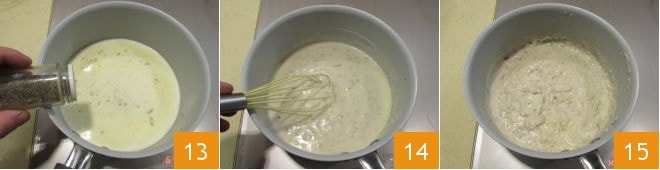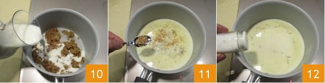 In der Zwischenzeit erwärmen Sie die Milch in einem kleinen Topf. Wenn Sie gut gemischt haben, fügen Sie die erwärmte Milch hinzu 10, die mit Muskatnuss aromatisiert ist 11. Würzen Sie mit Salz 12,