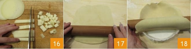 Schneiden Sie inzwischen 150 g Silano zuerst in horizontale Streifen und dann in kleine Würfel 16 und 200 g Silano in dünne Scheiben. Nun haben Sie alle Zutaten, die Sie benötigen, um Ihren herzhaften Kuchen mit Tropea-Zwiebeln und Silano zuzubereiten. Rollen Sie den Mürbeteig mit einem Nudelholz aus 17. Nehmen Sie eine runde Backform mit einem Durchmesser von 27 cm und legen Sie sie mit Backpapier aus. Rollen Sie nun den Teig auf dem Nudelholz auf und rollen Sie ihn über der Form ab 18, sodass er gut haftet.