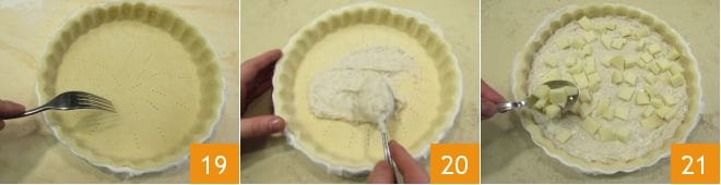 Stechen Sie den ausgerollten Mürbeteig mit einer Gabel ein 19. Fügen Sie dann die zuvor zubereitete Béchamelsoße hinzu und verteilen Sie sie gleichmäßig auf dem Teig 20. Geben Sie den in Würfel geschnittenen Silano über die Béchamelsoße 21