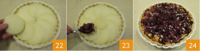 Fügen Sie nun auch den in Scheiben geschnittenen Silano hinzu 22. Legen Sie auch die zuvor angebratene Zwiebel auf die auf dem Mürbeteig verteilten Zutaten 23. Backen Sie nun Ihren herzhaften Kuchen mit Tropea-Zwiebeln und Silano in einem auf 180 °C vorgeheizten statischen Ofen für 40 Minuten (oder in einem Umluftofen bei 160 °C für 30 Minuten). Servieren und genießen Sie 24!