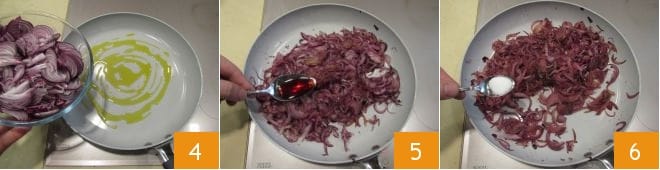 Während der Mürbeteig im Kühlschrank ruht, bereiten Sie die Füllung vor, beginnend mit der Tropea-Zwiebel. Schälen Sie die äußerste Schicht ab und schneiden Sie sie in nicht zu dünne Scheiben. Nehmen Sie eine beschichtete Pfanne, geben Sie einen Schuss Olivenöl extra vergine hinein und braten Sie die in Scheiben geschnittene Tropea-Zwiebel an 4, und lassen Sie sie bei mittlerer Hitze garen. Löschen Sie sie mit Rotwein ab 5 und fügen Sie fast am Ende der Garzeit eine Prise Zucker hinzu, um sie zu karamellisieren 6. Rühren Sie die Zwiebel mit einem Löffel um, damit sie gleichmäßig gegart wird. Wenn die Tropea-Zwiebel gar ist, geben Sie sie in eine Schüssel und lassen Sie sie abkühlen.