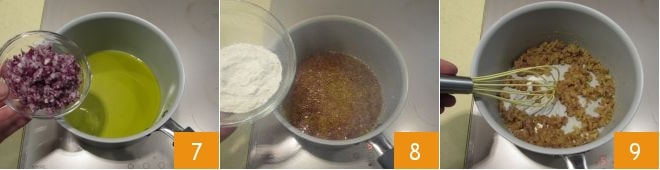 Fahren Sie nun mit der Zubereitung der Béchamel fort. Geben Sie einen Schuss Öl in eine Pfanne und braten Sie die fein gehackte Zwiebel darin an 7. Fügen Sie das Mehl hinzu 8 und mischen Sie es mit der Zwiebel, um Klumpen zu vermeiden 9.