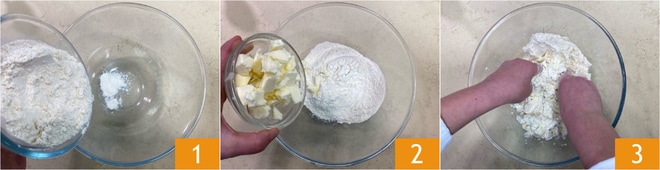 Um den herzhaften Kuchen mit Lauch und Brie zuzubereiten, bereiten Sie zuerst den Boden vor: Geben Sie das Mehl und das Salz in eine Schüssel 1, dann fügen Sie die kalte Butter in Würfeln hinzu 2 und arbeiten Sie schnell mit den Fingerspitzen, um eine sandige Masse zu erhalten 3.