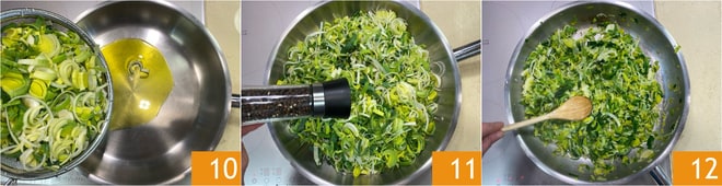 Erhitzen Sie einen Schuss Öl in einer Pfanne, dann fügen Sie den Lauch hinzu 10, salzen und pfeffern 11. Kochen Sie es bei mittlerer Hitze etwa 15 Minuten, bis es weich geworden ist 12. Schalten Sie das Feuer aus und lassen Sie es abkühlen.