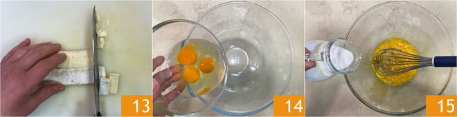 In der Zwischenzeit kümmern Sie sich um die Füllung: Schneiden Sie den Brie in Würfel, ohne die Rinde zu entfernen 13. Brechen Sie die Eier in eine Schüssel 14 und schlagen Sie sie mit einem Schneebesen, dann geben Sie die Sahne hinzu 15.