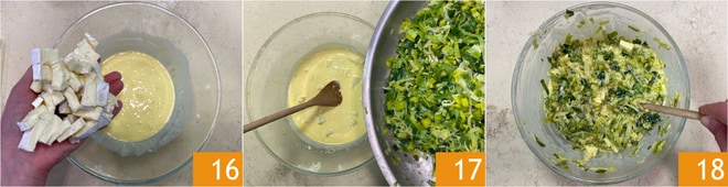Fügen Sie den gewürfelten Käse der Mischung hinzu 16, salzen, pfeffern und mischen Sie mit einem Löffel. Zuletzt fügen Sie den abgekühlten Lauch hinzu 17 und vermengen Sie alles 18.