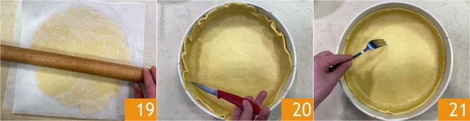 Jetzt nehmen Sie den Teig aus dem Kühlschrank, platzieren Sie ihn zwischen 2 Backpapierblättern und rollen Sie ihn mit einem Nudelholz auf eine Dicke von etwa 5 mm aus 19. Übertragen Sie den Teig mit dem Backpapier in eine Form mit einem Durchmesser von 28 cm, dann glätten Sie den Rand mit einem Messer 20 und stechen Sie den Boden mit einer Gabel ein 21.