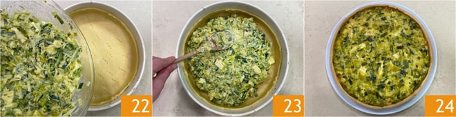 Gießen Sie die Füllung in die Form 22 und glätten Sie die Oberfläche 23, dann backen Sie es im statischen Ofen bei 180° für etwa 55 Minuten. Nehmen Sie es aus dem Ofen und lassen Sie es leicht abkühlen, bevor Sie Ihren herzhaften Kuchen mit Lauch und Brie servieren 24!