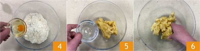 Fügen Sie das Ei hinzu 4 und kneten Sie weiter, dann geben Sie auch das kalte Wasser hinzu 5 und arbeiten Sie, bis es vollständig aufgenommen ist 6.
