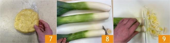 Wenn Sie einen glatten und homogenen Teig erhalten haben, wickeln Sie ihn in Frischhaltefolie 7 und lassen Sie ihn 30 Minuten im Kühlschrank ruhen. In der Zwischenzeit reinigen Sie den Lauch: Entfernen Sie die Enden 8 und den grünen Teil, dann halbieren Sie ihn der Länge nach und schneiden Sie ihn dünn 9.