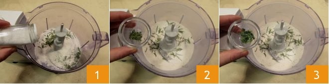 Um den herzhaften Kuchen mit Kartoffeln, Zwiebeln und Käse zuzubereiten, beginnen Sie mit dem Mürbeteig. Geben Sie das gesiebte Mehl zusammen mit den Rosmarinblättern in einen Mixer mit Klingen. Würzen Sie mit Salz 1 und Pfeffer und fügen Sie Thymian 2 und Majoran 3 hinzu.