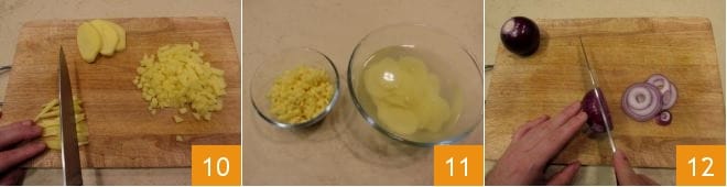 Schälen Sie die Kartoffeln und schneiden Sie 200 g in 3-4 mm große Würfel und 300 g in dünne Scheiben von 2 mm Dicke 10, dann tauchen Sie sie in kaltes Wasser, um zu verhindern, dass sie sich verfärben 11. Schneiden Sie die Zwiebeln in Ringe 12 und braten Sie sie in einer großen Pfanne mit dem Öl für 2 Minuten bei mittlerer Hitze an, wobei Sie einige davon beiseitelegen.