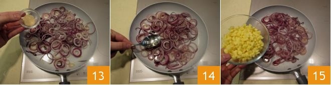 Fügen Sie auch den braunen Zucker hinzu 13, kochen Sie für weitere 2 Minuten, indem Sie die Gemüsebrühe (alternativ können Sie auch die gleiche Menge Wasser verwenden) 14 hinzufügen, dann die zuvor in Würfel geschnittenen Kartoffeln hinzufügen 15.