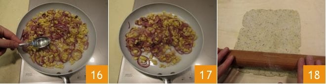 Kochen Sie alles für mindestens 15 Minuten bei mittlerer Hitze weiter, würzen Sie mit Salz und Pfeffer und fügen Sie weitere 2 Esslöffel Gemüsebrühe oder Wasser hinzu 16. Sobald es fertig ist 17, schalten Sie das Feuer aus und geben Sie die Füllung in eine Schüssel zum Abkühlen. Nach der erforderlichen Zeit nehmen Sie den Mürbeteig aus dem Kühlschrank, legen Sie ihn auf eine leicht bemehlte Arbeitsfläche und rollen Sie ihn mit einem Nudelholz 18 zu einem 1-2 mm dicken und 29 cm im Durchmesser großen Blatt aus.