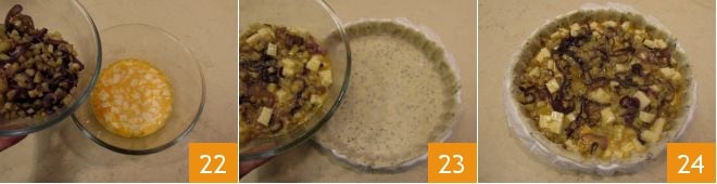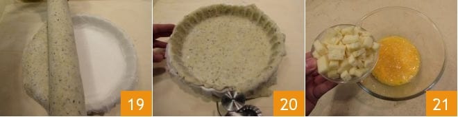Mit Hilfe des Nudelholzes rollen Sie den Teig in einer zuvor gefetteten und mit Backpapier ausgelegten Kuchenform mit einem Durchmesser von 29 cm aus 19. Drücken Sie die Basis und die Seiten mit den Fingern, damit der Mürbeteig optimal an der Form haftet, dann entfernen Sie mit einem Teigrädchen die überschüssigen Teile 20; bewahren Sie die Teigresten auf, da Sie sie als Dekoration verwenden können. Stellen Sie den herzhaften Kuchen für mindestens 20 Minuten in den Kühlschrank. In einer separaten Schüssel schlagen Sie die Eier mit einer Prise Salz und fügen Sie die Käsewürfel hinzu 21.