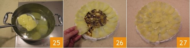 Blanchieren Sie die Kartoffeln für 20 Sekunden in heißem Salzwasser, lassen Sie sie abtropfen 25 und geben Sie sie in kaltes Wasser, damit sie die Stärke freisetzen. Lassen Sie sie gründlich abtropfen und legen Sie sie strahlenförmig im Kreis 26, beginnend mit dem äußeren Kreis und bedecken Sie die ganze Füllung 27.