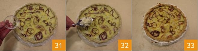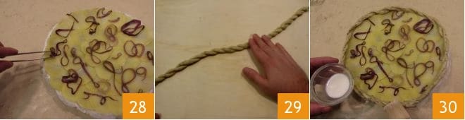 Fügen Sie auch die beiseitegelegte Zwiebel hinzu 28, formen Sie schließlich aus den Mürbeteigresten 2 Stränge der gleichen Größe wie die Kuchenform, die Sie zu einer Kordel flechten 29; platzieren Sie die entstandene Flechtkordel um den Kuchen und bestreichen Sie sie mit Milch 30.